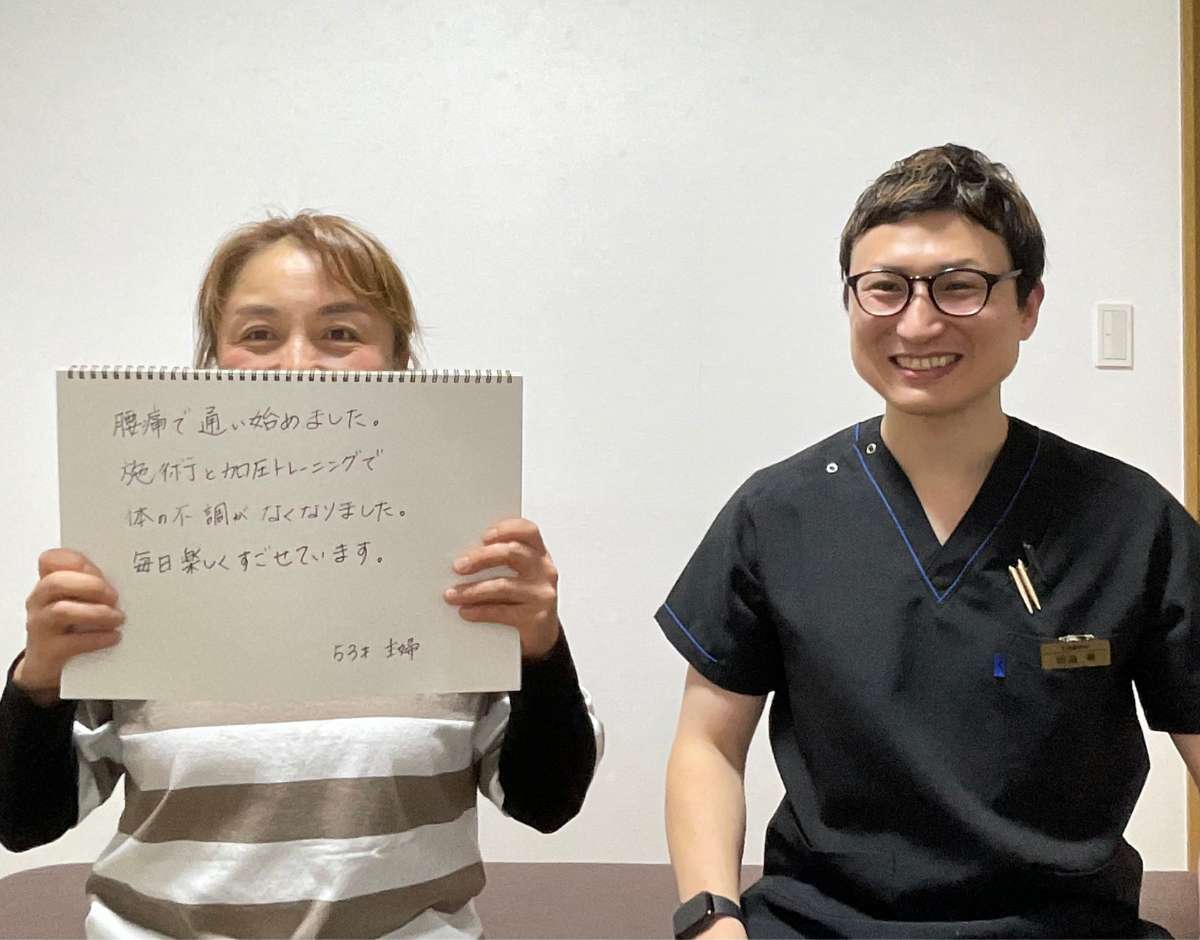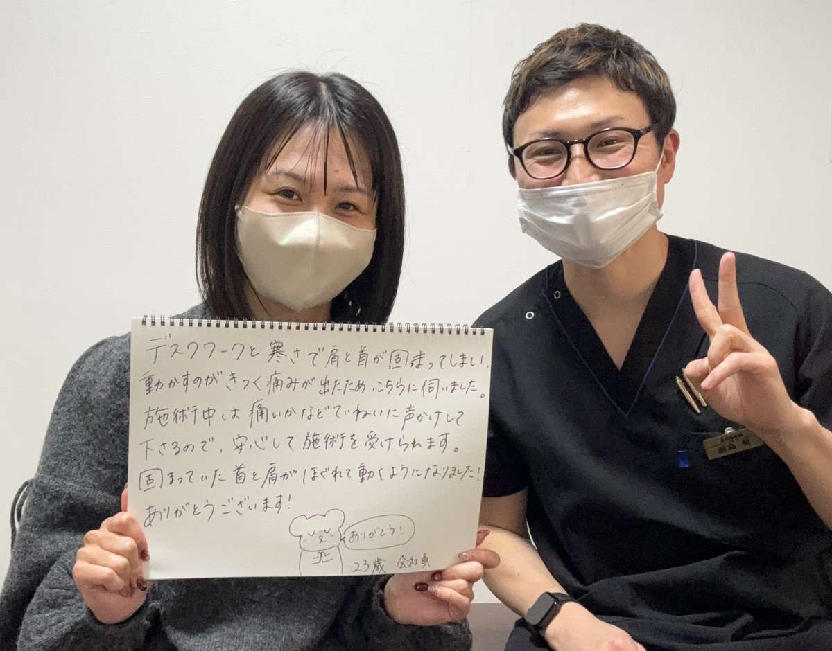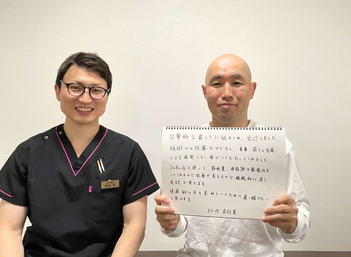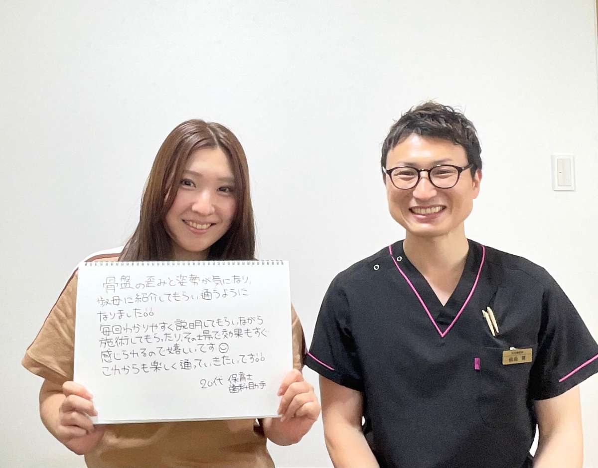 産後の腰痛をきっかけに来院し、10代から悩んでいた肩こりも相談したところ、先生に姿勢を整えていただいただけで痛みが軽減し、とても驚きました。
