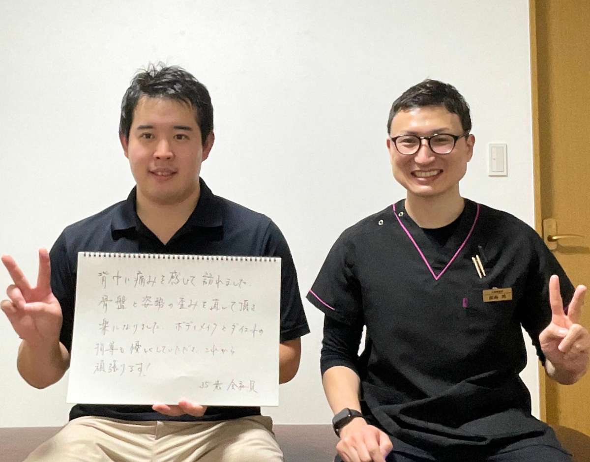 - 僕は足が痛くて来たんですけど、足じゃなくて肩とか腰とか首とかも色々あると思うんですけど、やっぱその体のそのなんて言えばいいんだろうな痛い理由が自分では分かんなくても整体師さんは分かってくれるのでなんだろうな痛いだけじゃなくて、デスクワークの方で腰が痛いとかいう方でも来ていただけたら必ず治ると思いますのでぜひ来てください