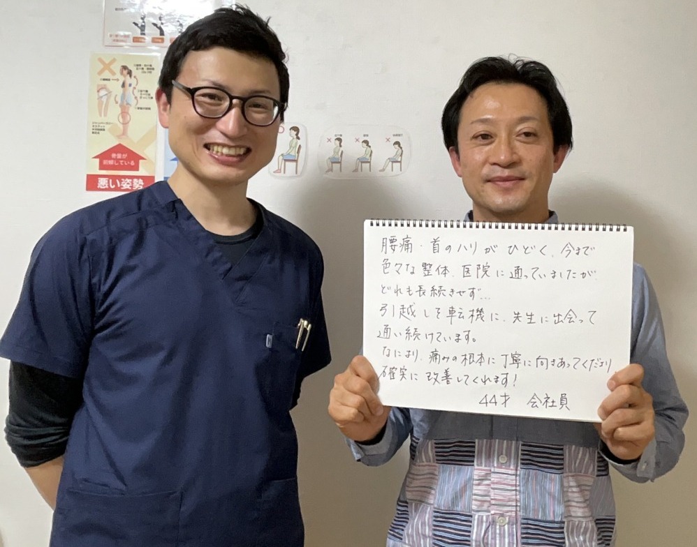 - 最近引っ越してきて良い整体がないか探していて、軽い整体ではなくて、僕はちゃんとした整体を探していたので評価が高いこちらに越さしてもらいました